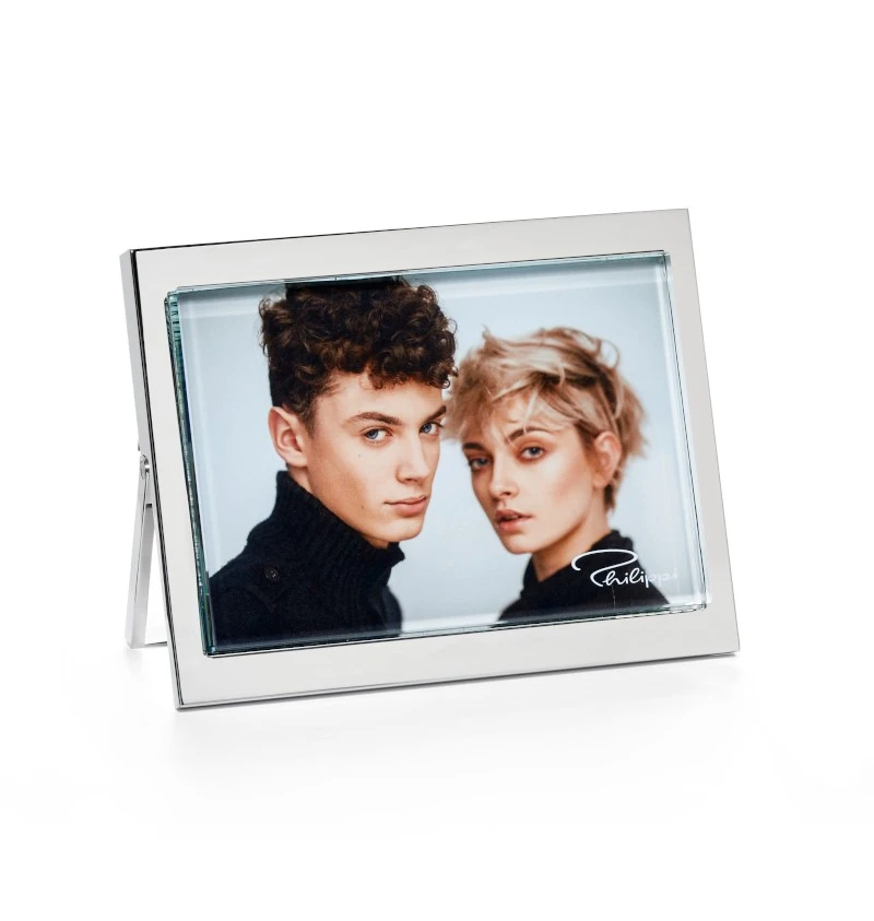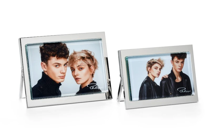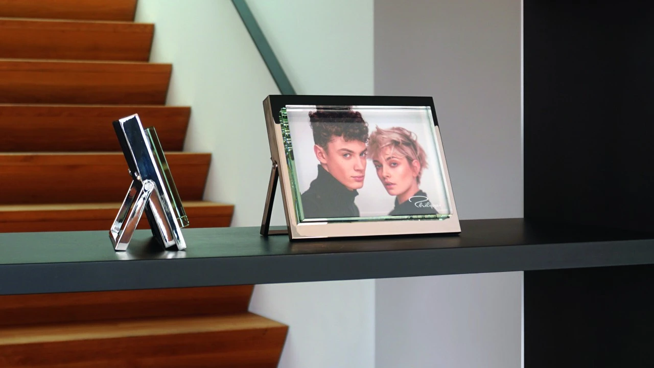Auf der Coolness-Skala von 1 bis 10 steht der Rahmen mindestens auf 12. Die schwere, massive Verarbeitung aus einem Metallguss-Nickel-Mix ist hochglanzpoliert und auf der Rückseite mit einem klappbaren Metallaufsteller versehen. Dazu ein 12mm dickes, erhöhtes Glas, das für ungesehene Perspektiven sorgt. So viel Glanz für den Schreibtisch im Büro oder Homeoffice.