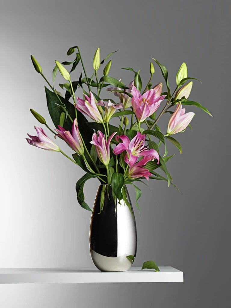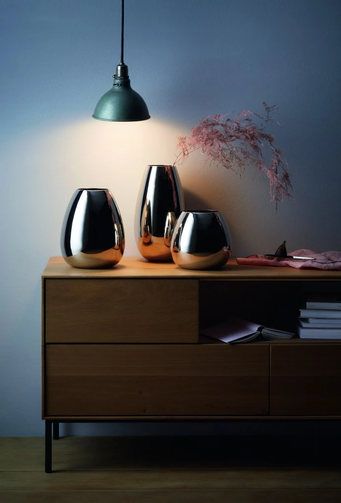 Die zeitlosen Vasen von Designer Andreas Ostwald lieben ein stabiles Umfeld im Luxus. Ihre makellose Verarbeitung aus einem Edelstahl-Nickel-Materialmix hat auch optisch Gewicht und haut so schnell nichts um. In drei unterschiedlichen Größen und Formen fühlen sie sich in Kombination mit üppigen Blumenbouquets im Eingangsbereich, Wohnzimmer, Büro oder in der Gastronomie am wohlsten.