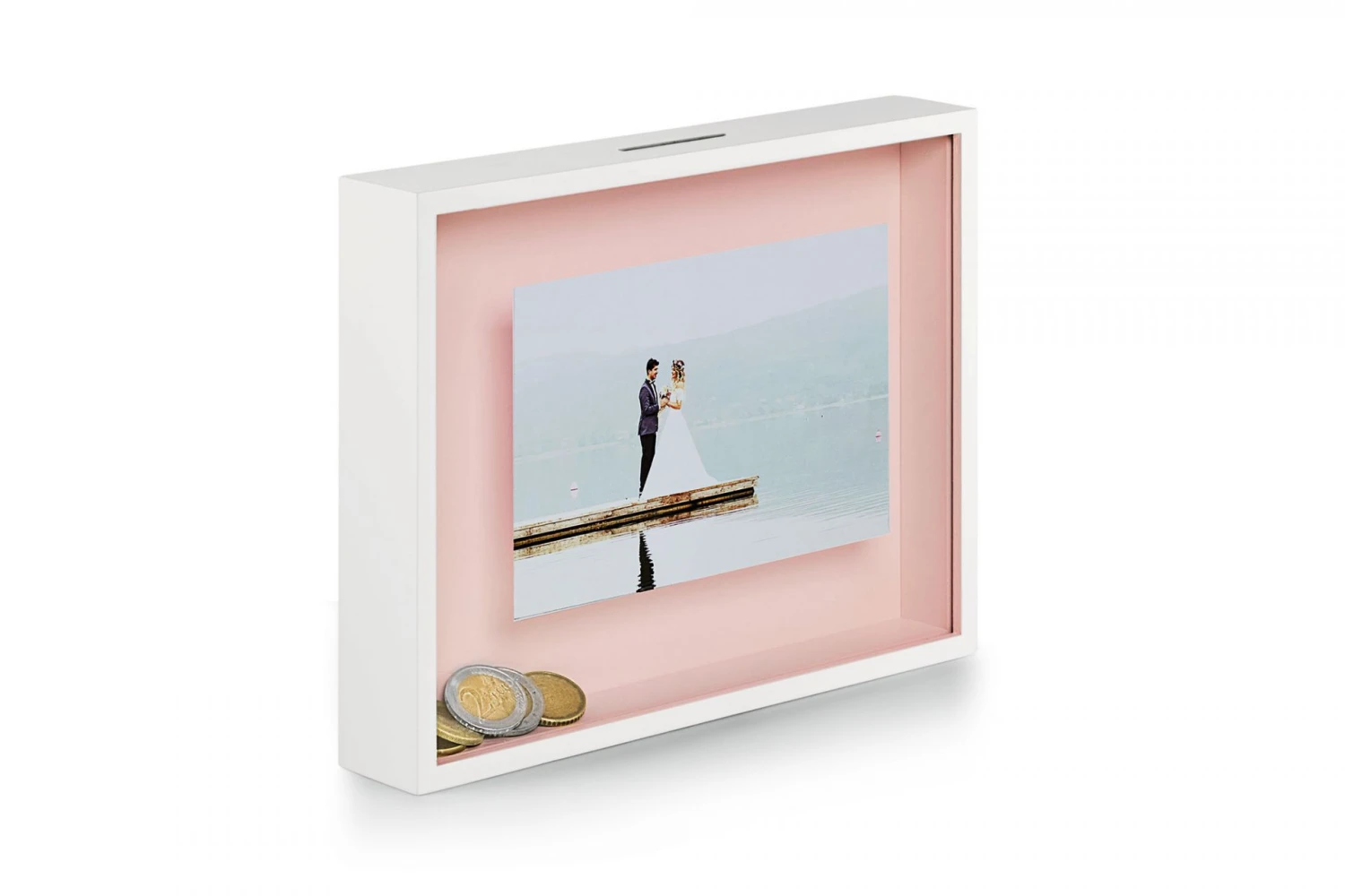 Bilderrahmen und Spardose in einem, so sehen Sie immer genau worauf Sie sparen – das ist ein echter Ansporn! Tag für Tag erinnert der Rahmen an die Pläne und so wächst mit dem gesparten Geld auch die Vorfreude.