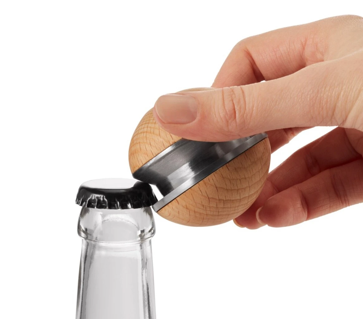 Was, in Herrgottsnamen, ist das? Und wie funktioniert es? Die erste Maßnahme, nachdem die Gäste eingetrudelt sind: Alle Anwesenden raten lassen. Umso erstaunter die Blicke, wenn BOULE mit einer lässigen Handbewegung den ersten Kronkorken von der Flasche löst. Während sich das Buchenholz angenehm in die Hand schmiegt, befreit der verspielte Flaschenöffner mit erstaunlich geringem Kraftaufwand Softdrinks und Bier vom Deckel. Ab sofort heißt es am Tisch: Roll mal rüber!