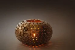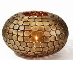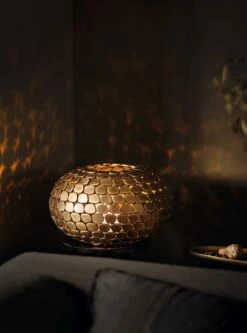 Durch das Zusammenspiel der einzelnen messingfarbenen Schuppen entsteht das einzigartige Design bei dem Curacao Windlicht. Wenn ein Teelicht entzündet wird, ist ein besonderes Lichtspiel zu beobachten und kreiert so eine ganz besondere Atmosphäre – sei es im Wohnzimmer oder auch auf der Terrasse.