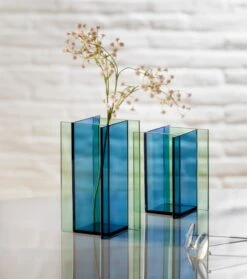 Bauhaus? 60th? 70th? 80th? Die Vase FLY möchte sich nicht festlegen und lässt sich nur ungern in eine Schublade pressen. Muss sie auch nicht, herzlich willkommen im 21. Jahrhundert, Beauty! Die geradlinige Geometrie zeugt dank unterschiedlich gefärbter Gläser in Grün und Blau von hoher Raffinesse. Je nach Blickwinkel ergeben sich neue interessante Farbabstufungen, weshalb sich florale Elemente ausnahmsweise eher auf Zweige oder getrocknete Gräser beschränken sollten. Der neue Liebling von Architekten und Designliebhabern kommt aber auch in Abwesenheit von pflanzlichem Dekor ziemlich gut zurecht.