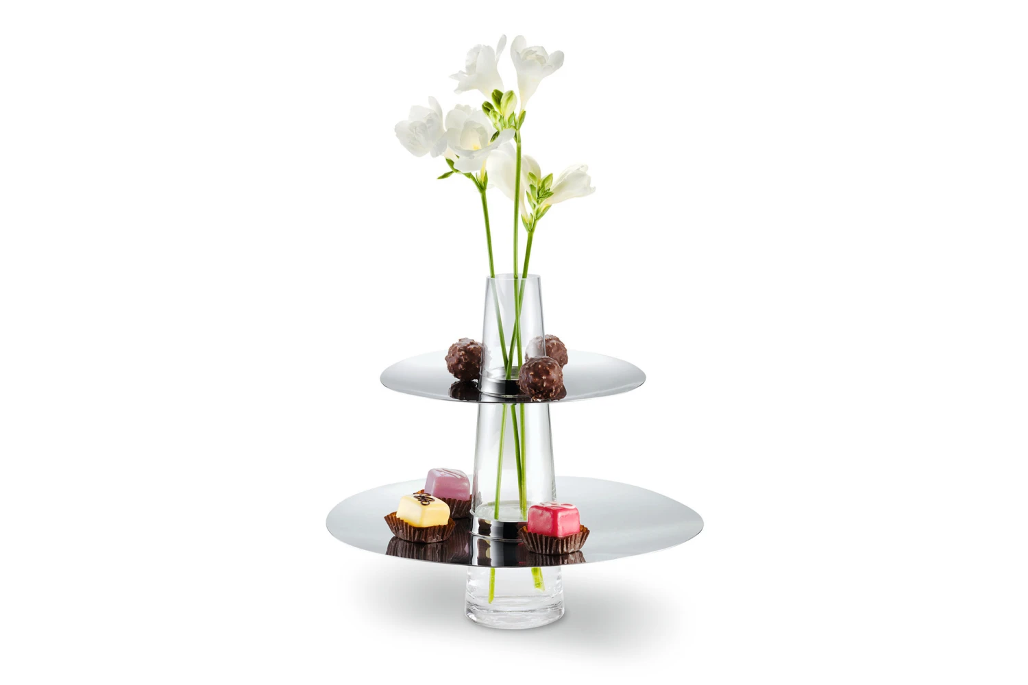 Doppeldecker: Fontaine von Philippi. Vase und Etagere zusammen? So etwas wie Fontaine sieht man nicht alle Tage. Gut so, denn so wirken die Pralinen, Petit Fours – oder was auch immer Sie Ihren Gästen kredenzen möchten – noch um einiges verlockender. Die Vase besteht aus hochwertigem Klarglas, die beiden Präsentierteller aus poliertem Edelstahl. Der preisgekrönte Entwurf stammt von den beiden Designern Murken und Hansen.