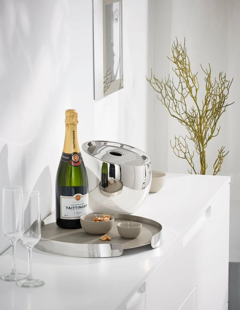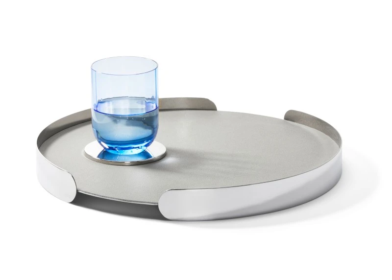 Ein Tablett, zwei Oberflächen, mehrere Funktionen, alles durchdacht! Beginnend mit der Umrandung, die verhindert, dass sich das zu tragende Gut in einer kurzen Phase der Unaufmerksamkeit einfach mal auf und davon macht. Unterbrochen von zwei sehr praktischen Griffmulden, die selbstredend keiner weiteren Erklärung bedürfen. Getoppt von einer Auflage aus Lederimitat, die das Verrutschen beim Transport verhindert und zudem x-fach abwaschbar ist, ohne je ihr Leid zu klagen. Gekrönt von einer hochglänzenden Rückseite, die den ohnehin schon hohen Champagner-Glamour-Faktor dank Spiegelung gleich noch verdoppelt. Einen Toast auf FROID!