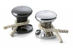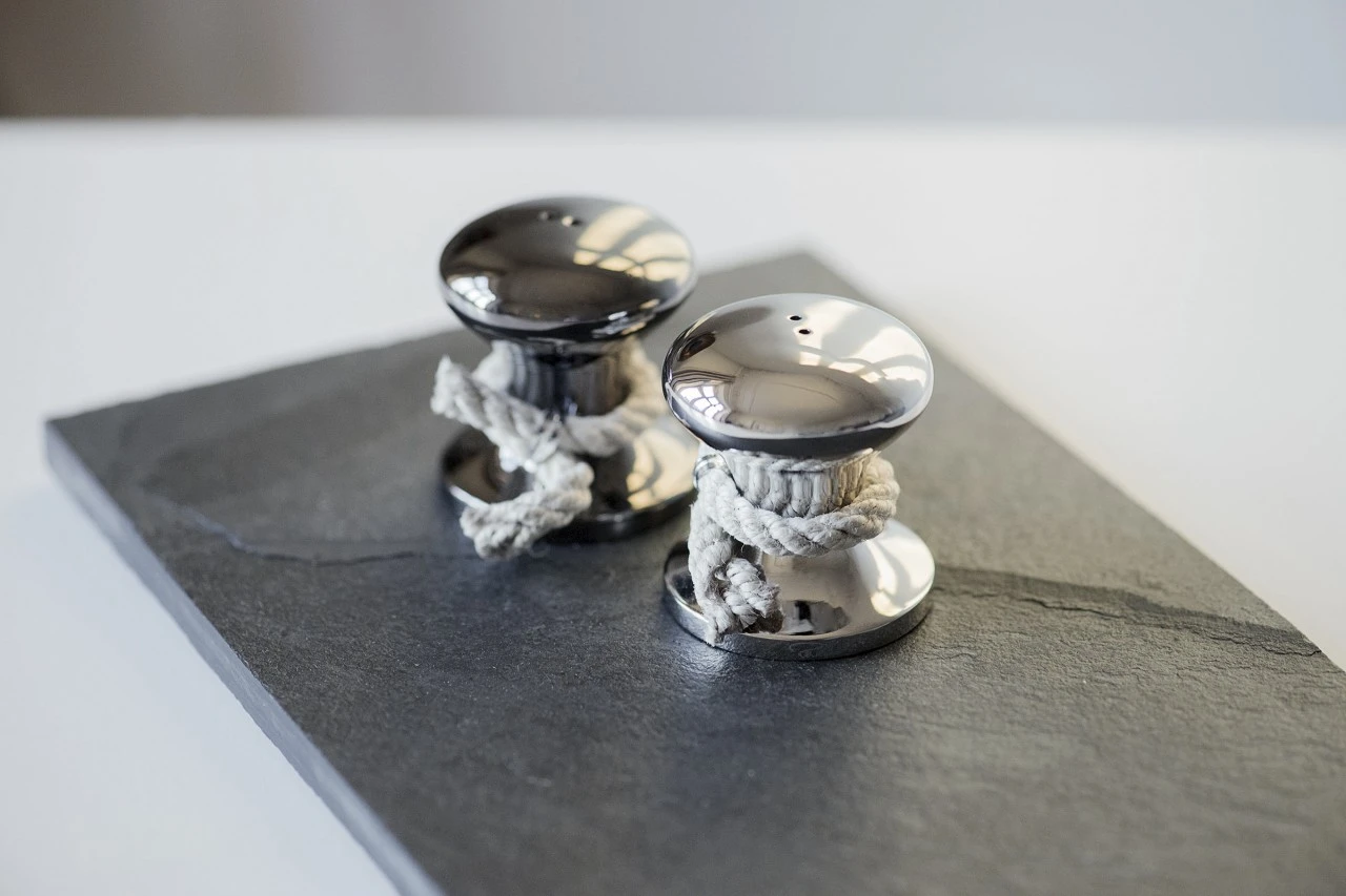 Die HAMBURGER STREUER für Salz und Pfeffer garantieren stilsicher maritime Anlegemanöver bei Tisch. In ihrer Form einem Schiffspoller nachempfunden, liegen sie beim Würzen mit griffiger Taille und verspielt umgelegtem Tau sicher in der Hand. Silber glänzend für Salz und schwarz schimmernd für Pfeffer, die doppelte Aufmerksamkeit verspricht einen souverän hanseatischen Auftritt.