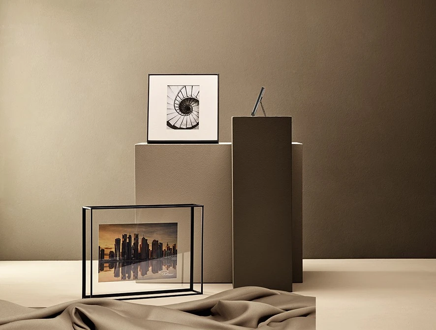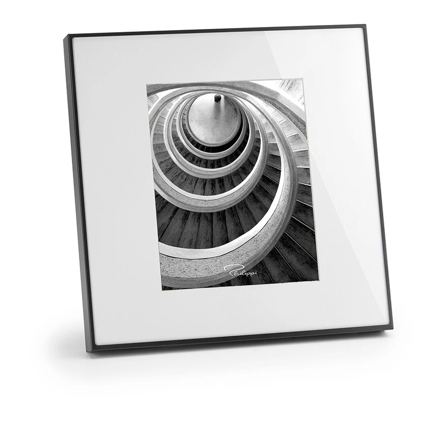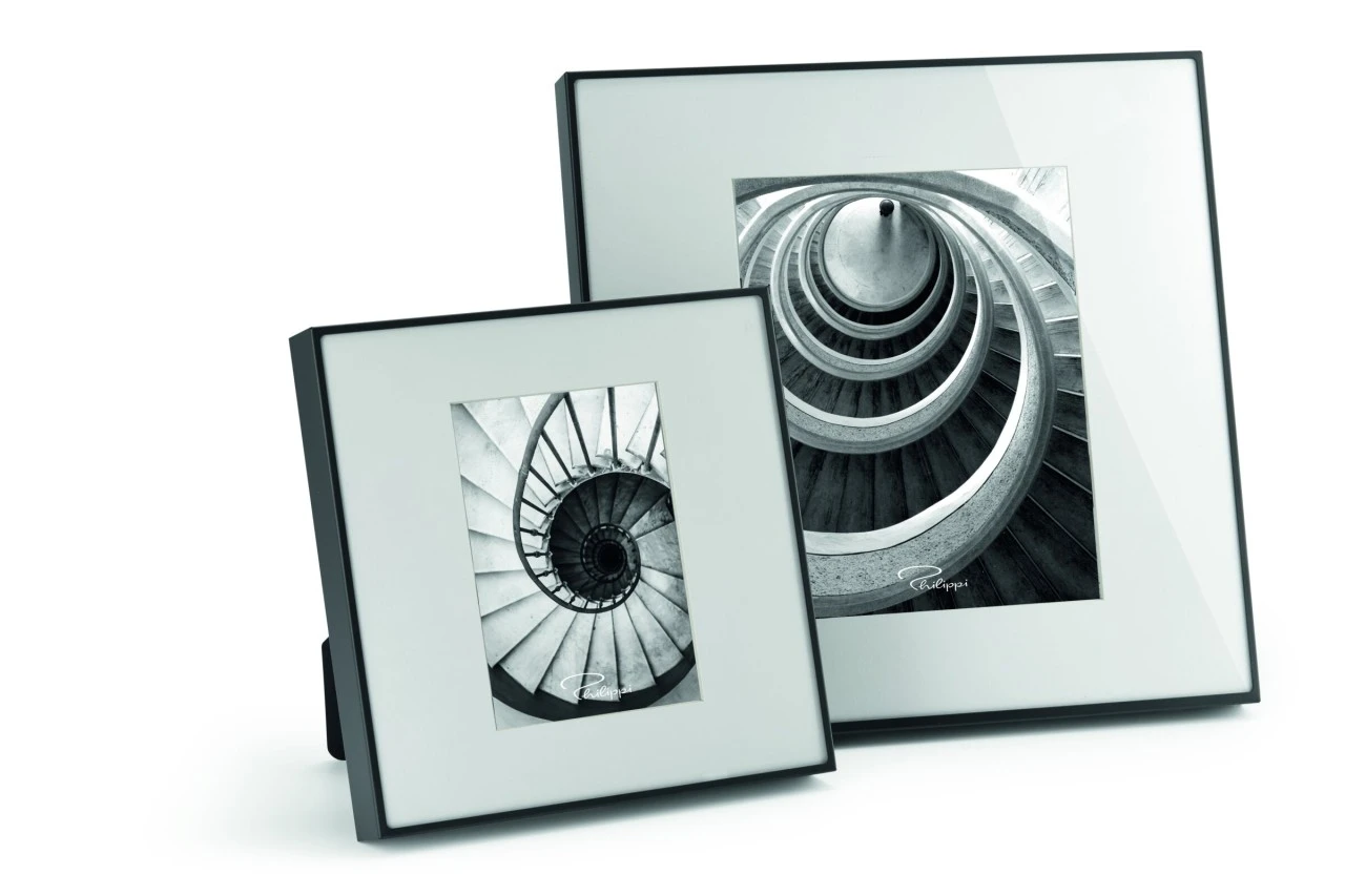 Das ist Minimalismus pur. Weniger geht nicht. Und mehr schon gar nicht. Der kleine Unterschied liegt, wie so oft, im Detail. Dieser hochwertige Rahmen hat innen abgerundete Ecken und besteht nicht, wie oft üblich, aus lediglich zusammengesteckten Profilleisten. Der große Unterschied liegt im Passepartout. Erst das Rechteck im Quadrat macht den wahren Reiz von INFINITY aus. Hoch oder quer, it’s up to you! Tiefschwarz und matt pulverbeschichtet, ein starker Kontrast, der sich besonders für Postkarten oder Typografie aus dem Kunstgewerbe eignet.