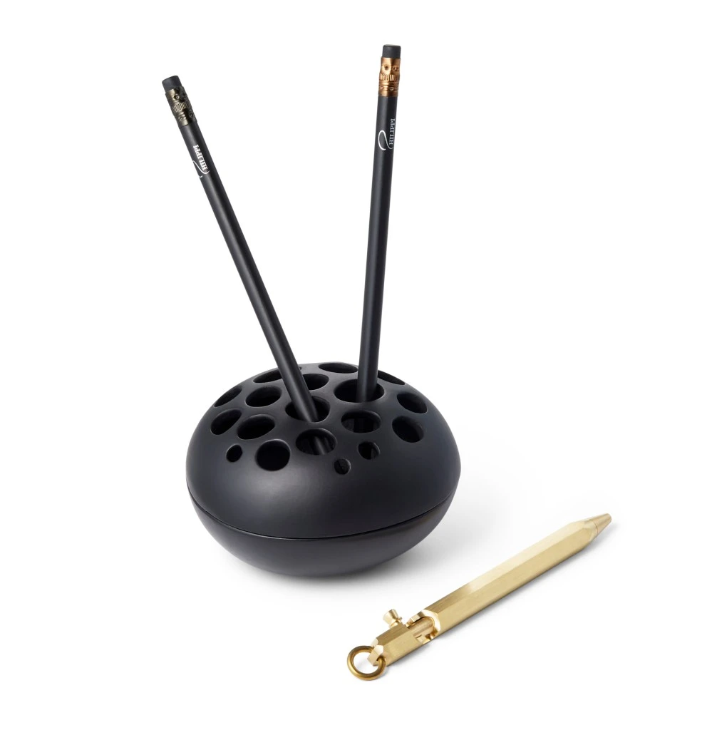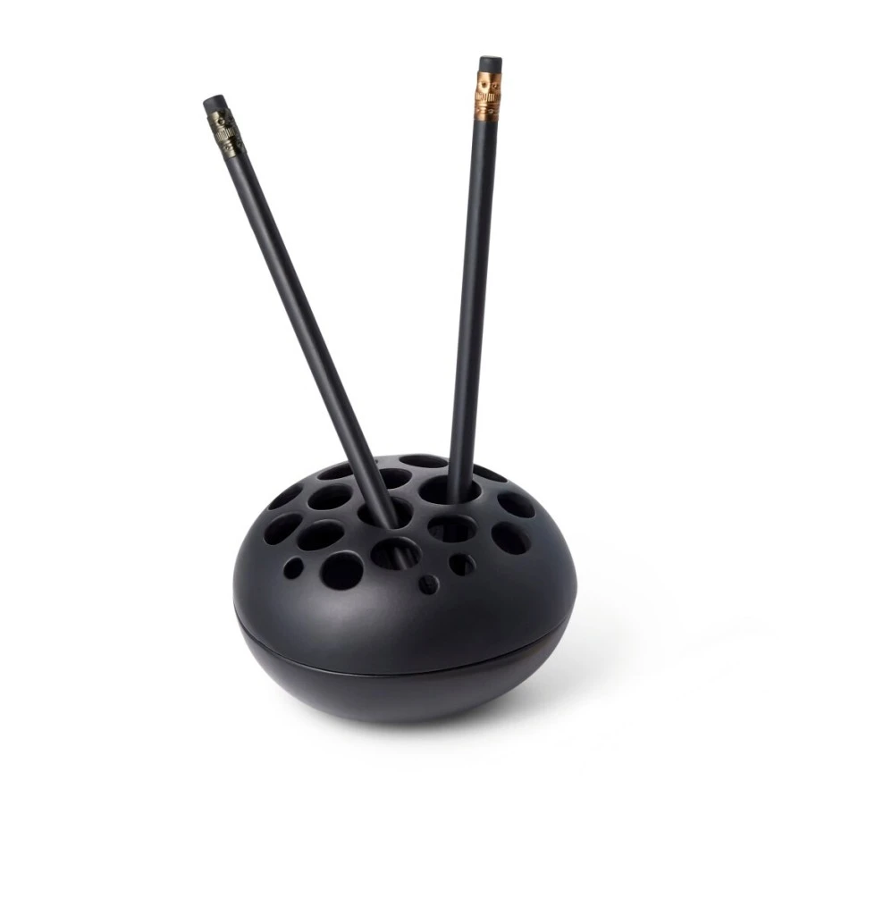 LAVA bringt kreative Ordnung ins alltägliche Schreibtisch-Chaos und schont die Nerven. Ohne lange Suche in den endlosen Tiefen von Schubladen sind Schreibwerkzeuge für Notizen und Unterschriften stets in Griffweite. Bei der Gestaltung hat sich Designer Jörg Langkop von großporigem Lavagestein inspirieren lassen, denn die einfachsten und besten Ideen liefert nach wie vor die Natur. Dabei sind die verschieden großen Öffnungen sind für unterschiedliche Stiftdurchmesser gedacht. Funktional durchdacht ist ein Gitter im Boden, das für den geraden Stand der Stifte sorgt. Auch Pinsel lassen sich hier prima kurzzeitig abstellen, ohne große Kleckereien zu verursachen.