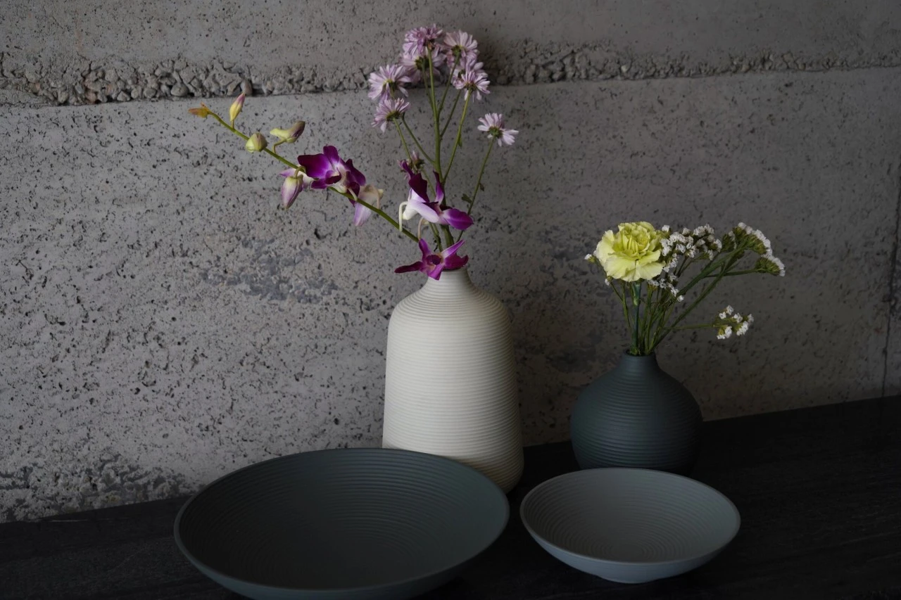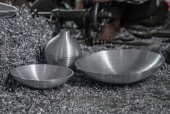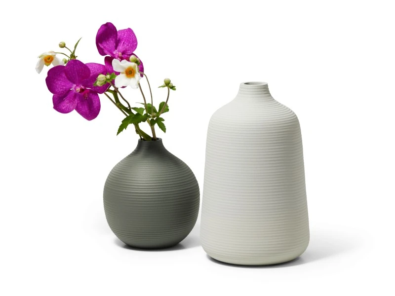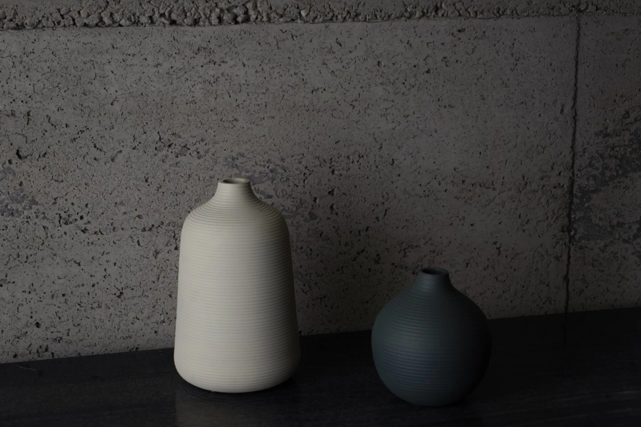 Ätsch! Klassisch angeschmiert fühlen darf sich, wer bis eben noch auf Steingut getippt hat. Wahrhaft keine Schande, nein, denn hinter der gut gehüteten Fassade verbirgt sich ein massiver Korpus aus Aluminium, der – jetzt wird’s tricky – mit einer makellosen Pulverbeschichtung überzogen wurde. Das hat Gewicht! Und ist zudem außerordentlich bruchsicher. Und dass die Vasen bei aller Schummelei noch so verdammt gut aussehen, muss eigentlich gar nicht mehr erwähnt werden …