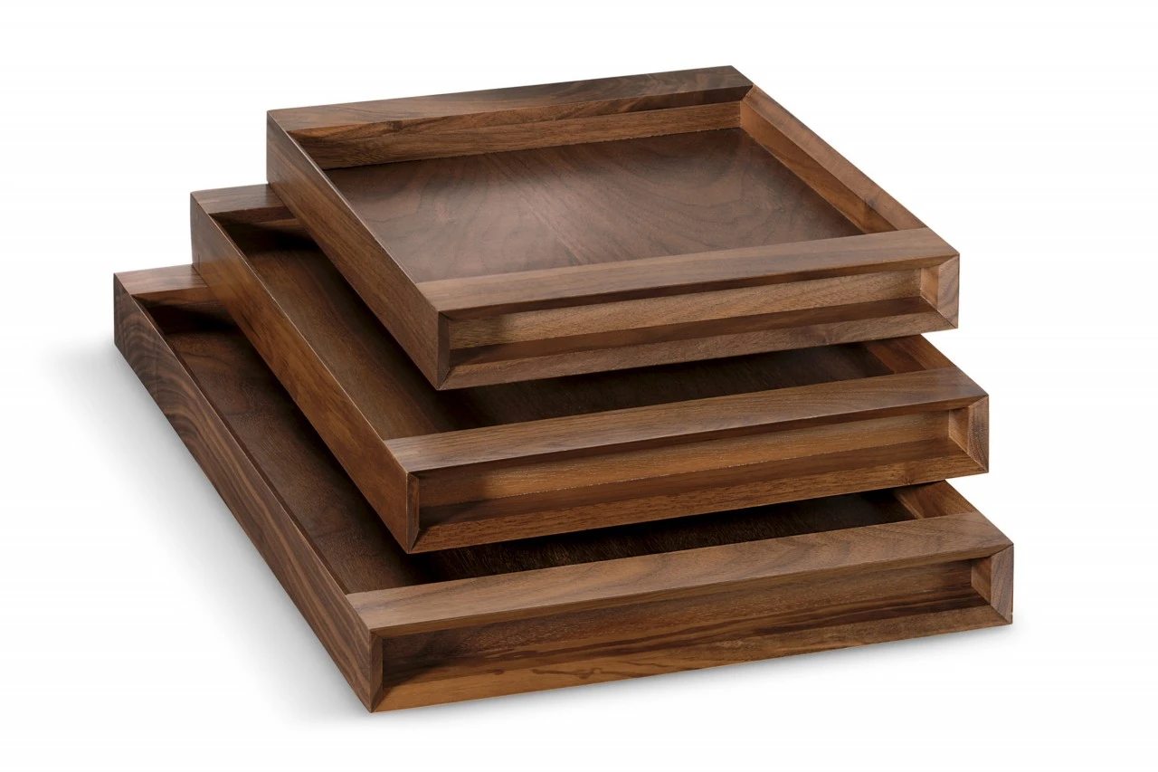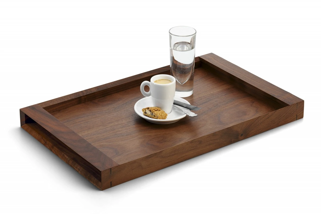 Das Tablett LODGE aus dunklem Walnussholz ist ein würdevoller Träger, nach alter Rahmenkunst von Hand gefertigt. Eckig und stark, zugleich weich geschliffen und sicher im Griff, lässt das Tablett keine Wünsche offen und ist für die Ewigkeit gemacht. Mit LODGE gelangt das Frühstück ans Bett und der Kaffee in den Garten; zum Deko-Plateau avanciert es mit Kerzen und Coffee Table Books.