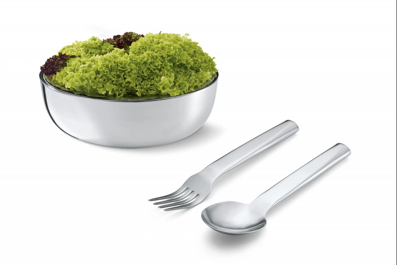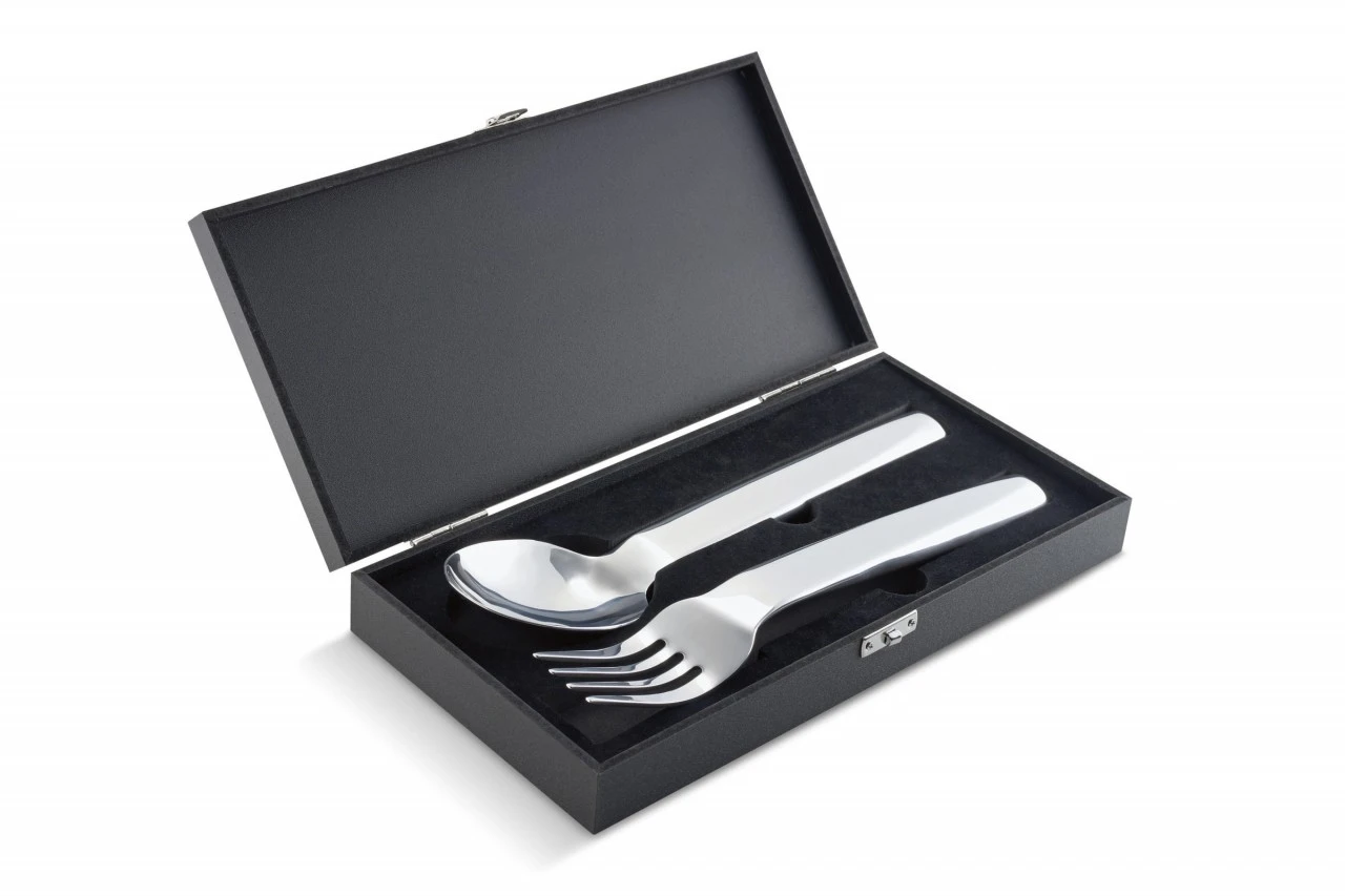 Das Salatbesteck LOLLO ist nicht nur ein praktischer Helfer für alle Salatfreunde, sondern bringt gleichzeitig modernes Design in die Küche. Salatgabel und Salatlöffel haben eine angenehme Schwere und liegen so perfekt in der Hand, dass jeder gerne damit auftischen möchte. Der polierte Edelstahl ist zusätzlich spülmaschinengeeignet. LOLLO kommt in einer schwarzen Holzbox.