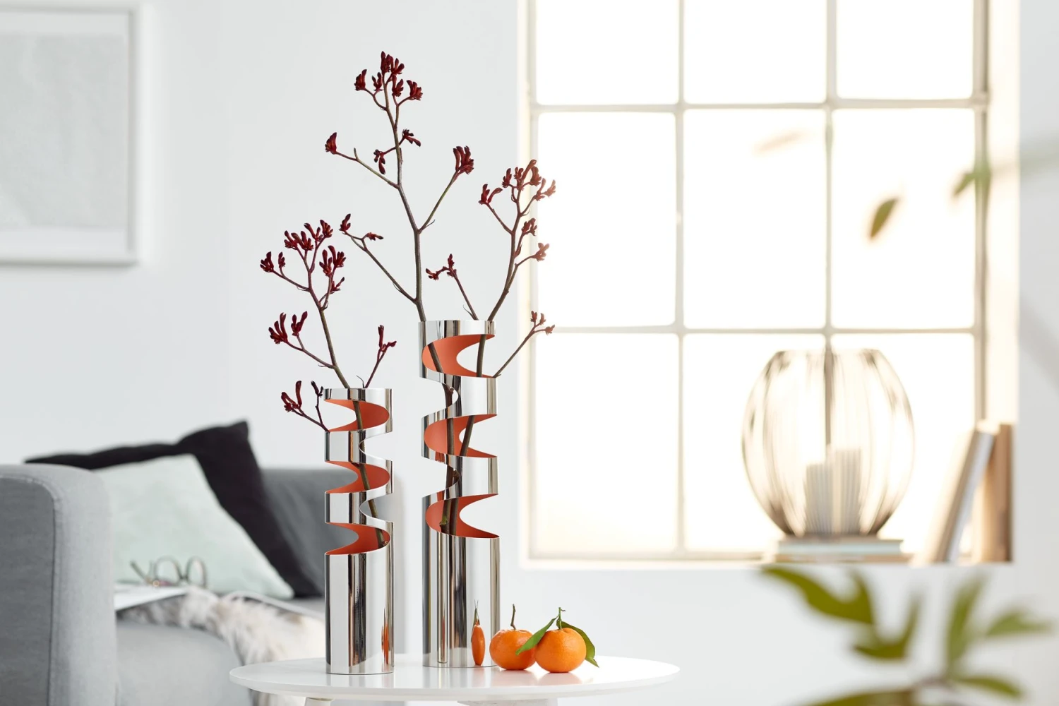 Diese Vase lebt von ihrer besonderen Form – durch die versetzten Ausschnitte im hochglanzpolierten Edelstahl der Vase wird die auffällige Innenlackierung sichtbar. Deshalb sieht die Vase auch ganz ohne Inhalt super aus und kann die Einrichtung mit kleinen Farbakzenten ergänzen. Die Vase besitzt einen Durchmesser von 8cm und ist 31cm hoch. Das Gewicht beträgt 400g.