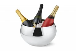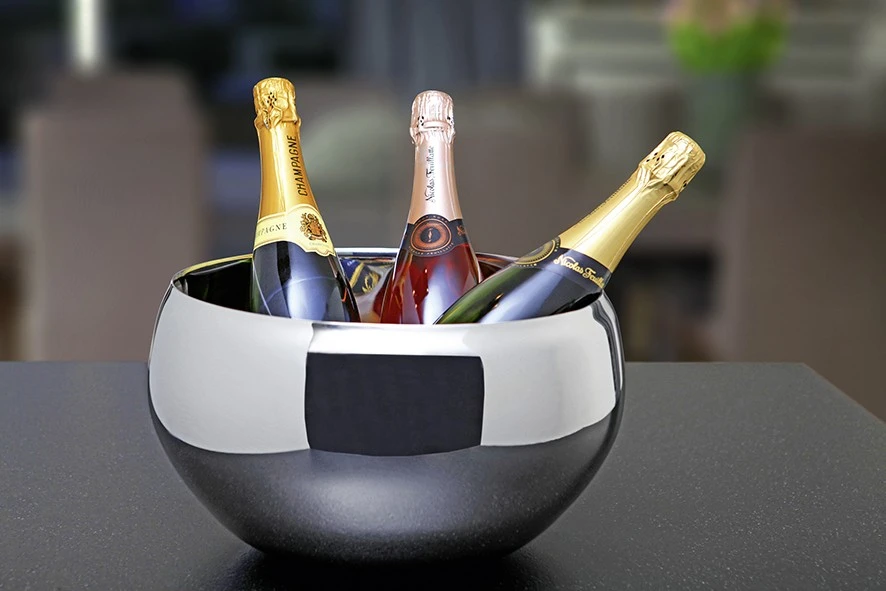 Noch weit bevor der spiegelnd glänzende Champagnerkühler NIZZA mit irgendeiner Form von Eiswürfeln in Berührung kommt, darf er schon als cool bezeichnet werden. Die voluminös, bauchige Form erhält zusätzlich vornehme Coolness von seiner doppelwandigen Beschaffenheit für lang anhaltend niedrige Temperaturen. So gesehen werden die Nächte wieder länger, wenn sich das Eisbad nach und nach mit Flaschen spritziger Tropfen füllt.
