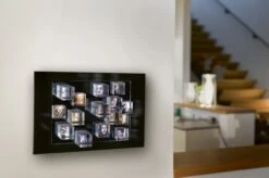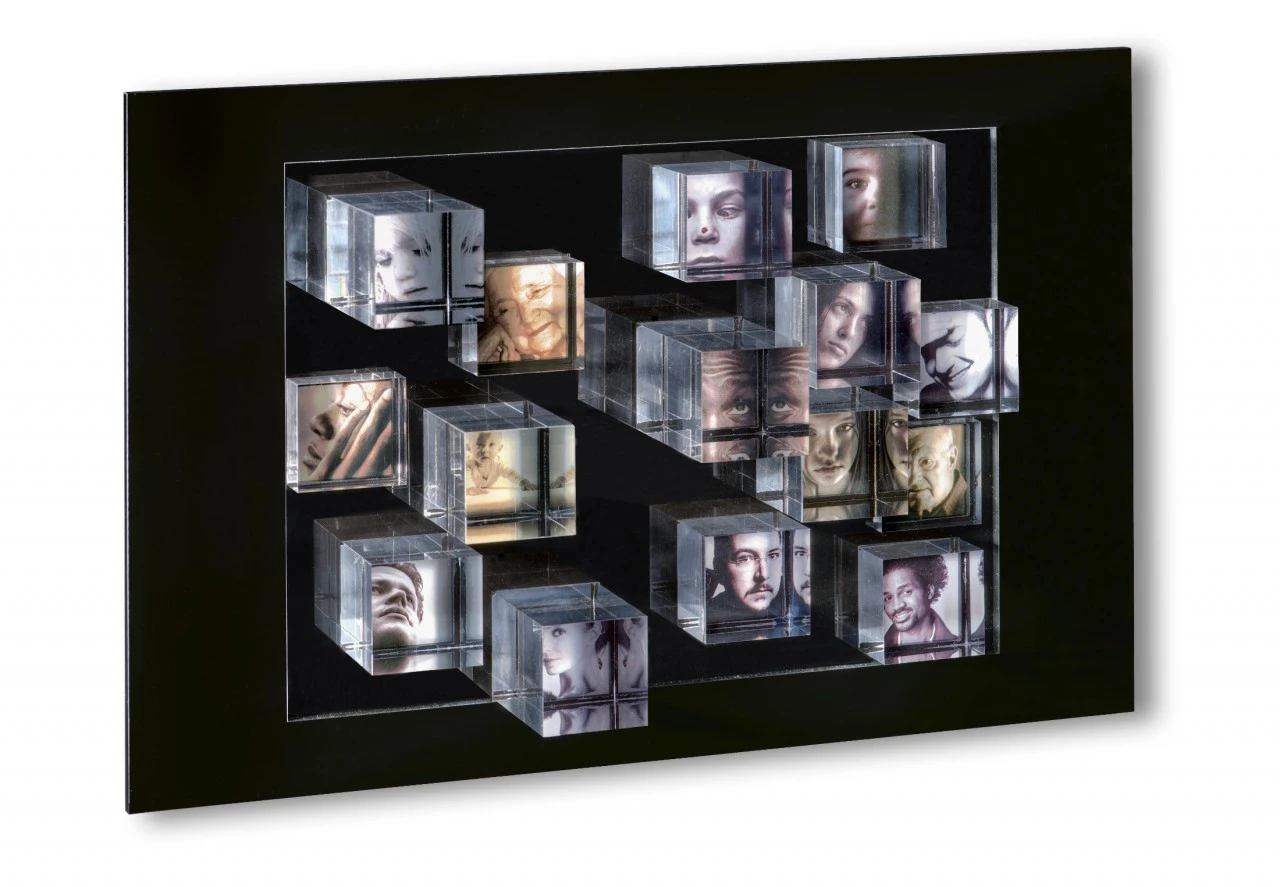 Auf avantgardistische Weise erheben sich bei dem Fotorahmen ROCKY MOUNTAIN 15 glasklare Arcylglaswürfel und geben die Sicht frei auf Ihre schönsten Bilder. Der Clou dabei: die Fotos werden auf der Rückseite hinter die Kuben gelegt und von der schwarzen Rückwand mit Magneten gehalten. ROCKY MOUNTAIN wurde 2009 mit dem Design Award FORM# ausgezeichnet.