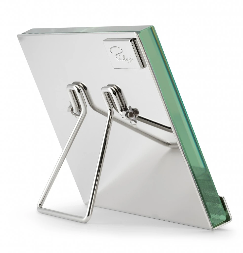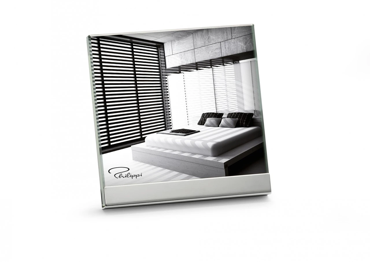 Allein die beeindruckende, 10 mm tiefe Glasscheibe krönt ROOM zu einem visuellen Schwergewicht auf dem Schreibtisch oder Sideboard. Der angenehm schnörkelbefreite Glasrahmen im Retro-Look ist in geradezu perfekter Weise für einen festen Stammplatz im Office bestimmt. Dank der verspiegelten Rückseite in Verbindung mit dem elegant geschwungenen, praktischen Aufsteller gehört er zu den wenigen Rahmen, die sich auch von hinten sehen lassen können. Die untere Kante aus hochglanzpoliertem Nickel zeugt von einem hohen Grad an Ästhetik und bietet gleichzeitig eine Art Bühne für alle persönlichen Fotos und Abbildungen.