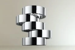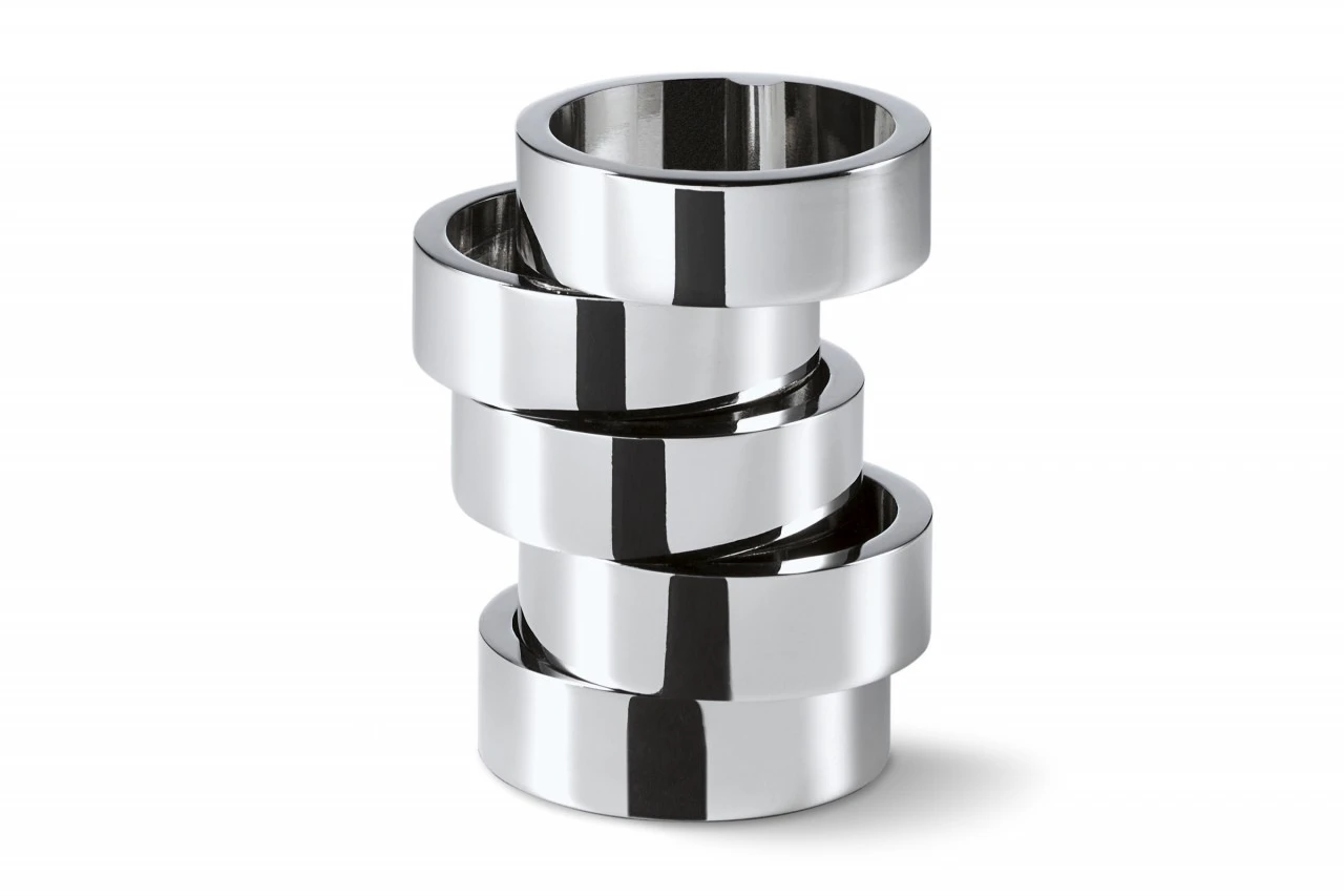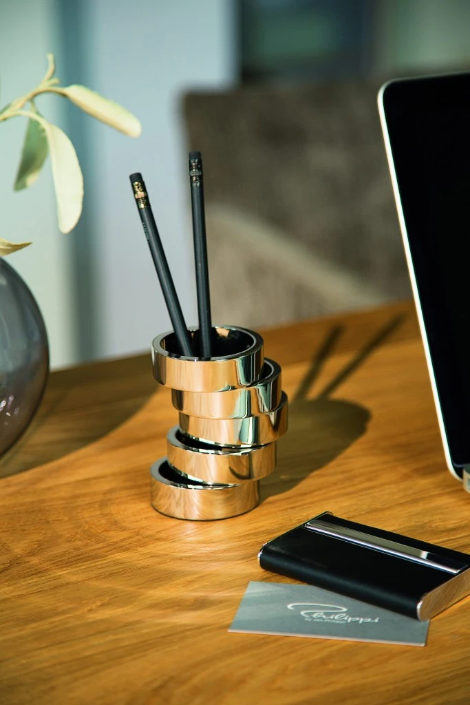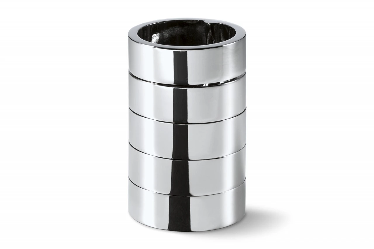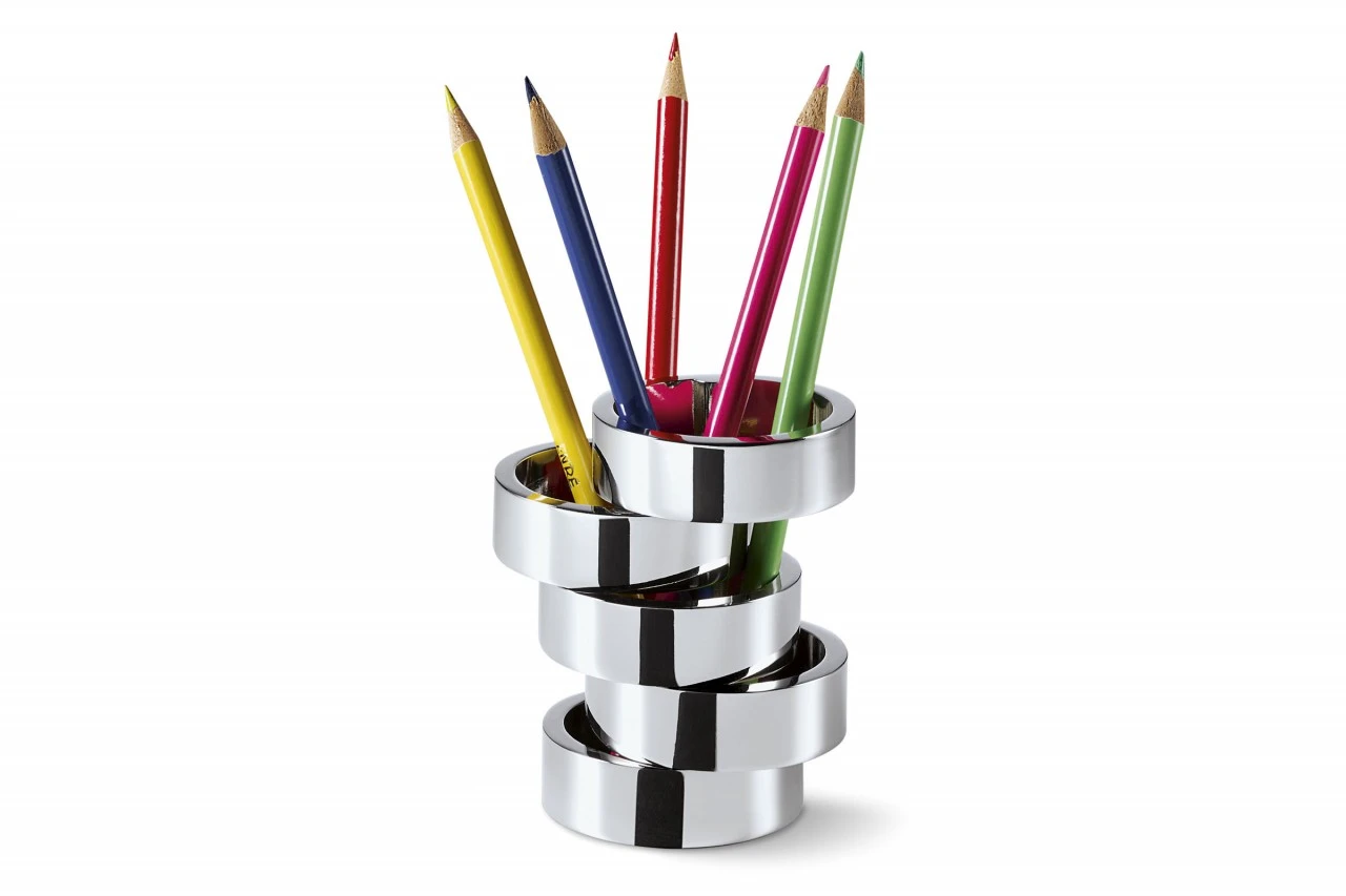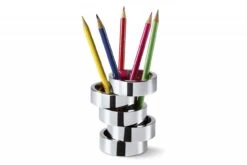 Fünf Ringe, die mehr halten als gedacht. ROTONDO steht als Stifthalter fest in der Brandung des Alltags und hält Ordnung. Auf dem Schreibtisch mit Stiften, Kugelschreiber und Leuchtmarker, im Bad mit Schminkpinseln und –accessoires oder immer dort, wo er gebraucht wird. Die einzelnen Elemente lassen sich drehen und begeistern neben dem Sinn für Pragmatismus auch den für Ästhetik.
