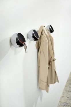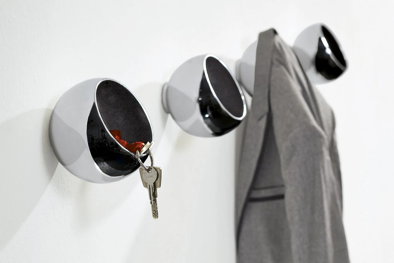 Garderobenhaken sind praktisch, aber selten wirklich schön. SPHERE ist da anders. Die Garderobenkugel verbindet Nützliches mit Design und wirkt immer wie ein Kunstobjekt an der Wand. Einmal befestigt bietet SPHERE Platz für nahezu alles, was man täglich bei sich hat und an einem Platz verwahrt haben möchte. In der glänzend polierten Kugel finden Autoschlüssel, Geldbörse, Kopfhörer oder Handschuhe Platz; Tasche, Hundeleine, Schal oder Jacke werden einfach drüber gehängt. Und bei mehreren Kugeln nebeneinander ist nicht nur mehr Stauraum zum Ablegen, sondern auch mehr Staunen beim Betrachten garantiert.
